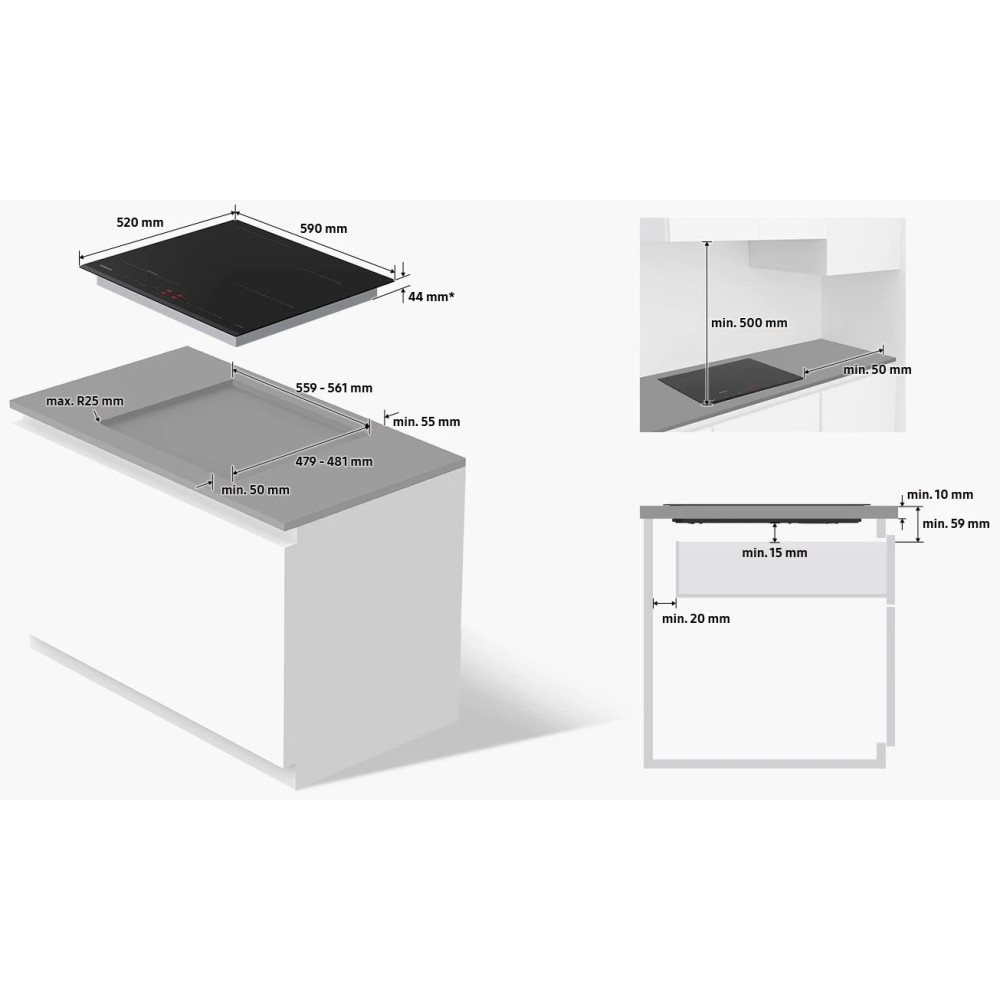 Потужність конфорок, кВт Flex Zone: 3.3/3.7; 2х2/3,2; 2,3/3,2; 1,4/2