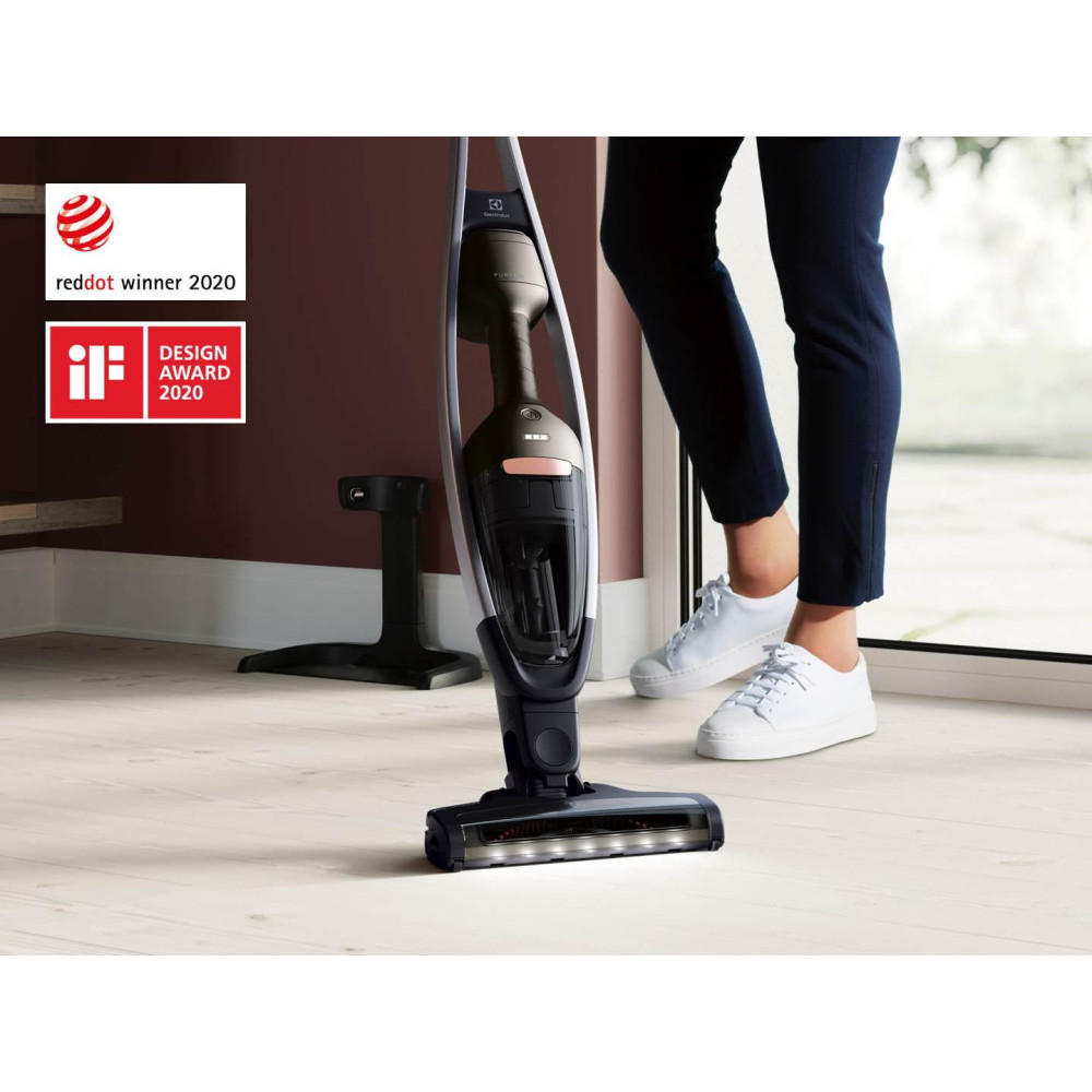 Пилосос 2в1 (вертикальний + ручний) Electrolux PQ91-ANIMA - зручний і продуктивний апарат, за допомогою якого проводиться якісне сухе прибирання. Він живиться від літій-іонного акумулятора, при цьому час роботи на мінімальній швидкості складає 55 хвилин, а на максимальній - 15 хвилин. Обрана потужність всмоктування підтримується постійною, незалежно від наповненості контейнера пилозбірника. У комплект поставки включені чотири насадки: для підлоги та килима, щілинна для важкодоступних місць, для м'яких меблів і текстилю, а також турбощітка. Особливістю щітки є функція Brush Roll Clean, яка видаляє волосся з насадки і активується натисканням на педаль навіть при вимкненому пристрої. Рівень шуму при роботі пилососа Electrolux PQ91-ANIMA не перевищує 76 дБ, а зберігатися прилад може як в горизонтальному, так і у вертикальному положенні