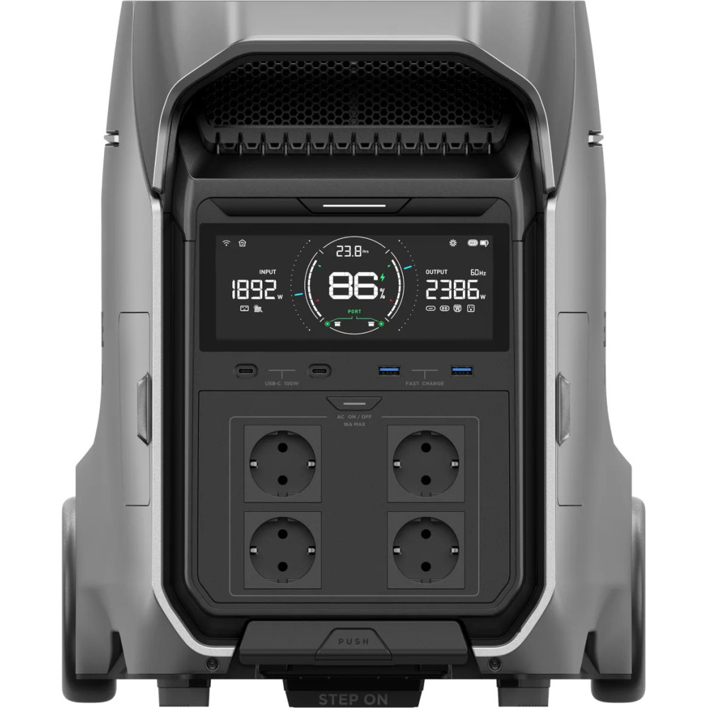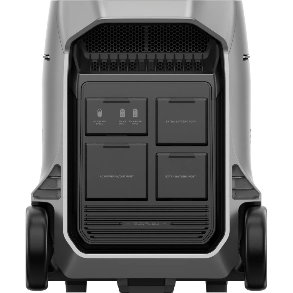 EcoFlow DELTA Pro 3 EU-Version (EFDELTAPRO3-EU-CBox) - це універсальна зарядна станція з номінальною потужністю 4000 Вт, яку можна збільшити до 6000 Вт за допомогою технології X-Boost. Пікова потужність пристрою сягає 8000 Вт, що дає змогу використовувати його для живлення різних приладів, включно з тими, що потребують більше енергії. Станція має 7 розеток AC 230В, 2 порти USB Type-C з потужністю 100 Вт кожен, 2 порти USB Type-A на 18 Вт і автомобільну розетку потужністю 378 Вт. Також передбачені порти XT60, Anderson і XT60i для підключення зовнішніх пристроїв. В основі пристрою лежить акумулятор на базі технології LiFePO4 з ємністю 4096 Вт-год, який розрахований на 4000 циклів зарядки до 80% ємності. EcoFlow DELTA Pro 3 EU-Version (EFDELTAPRO3-EU-CBox) підтримує функцію ДБЖ, що допомагає захистити підключені прилади від перебоїв в електроживленні. Час заряджання від звичайної розетки становить 1 годину за потужності до 3600 Вт, також можливе під'єднання сонячних панелей із потужністю до 2600 Вт. Пристрій оснащений дисплеєм і підтримує віддалене управління через Wi-Fi і Bluetooth. Незважаючи на вагу в 51,5 кг, станція легко переміщується завдяки колесам і вбудованій ручці. EcoFlow DELTA Pro 3 EU-Version (EFDELTAPRO3-EU-CBox) сумісна з додатковими батареями та сонячними панелями, що дає змогу розширити її можливості.